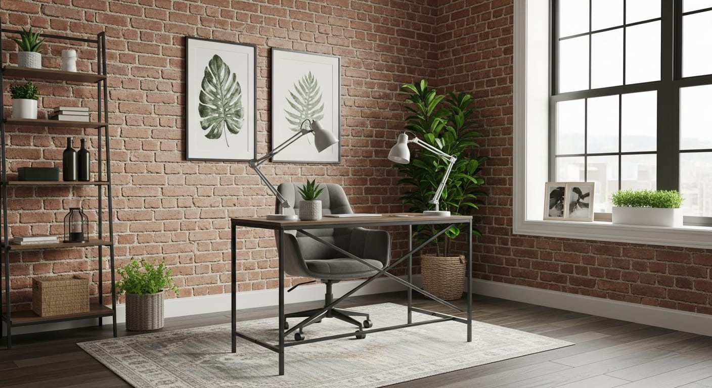 If you prefer modern minimalism, paint the brick in soft gray or off-white tones. Add touches of greenery to balance the ruggedness with life and color. Natural light plays beautifully off brick, so position your desk near a window when possible.
