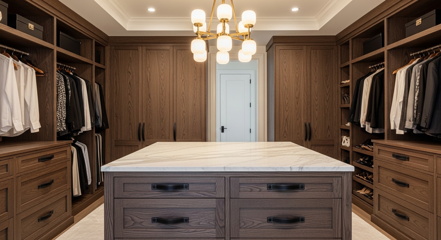 A central island transforms your closet from a storage room into a luxurious workspace. Use it as a folding station, accessory display, or vanity table.