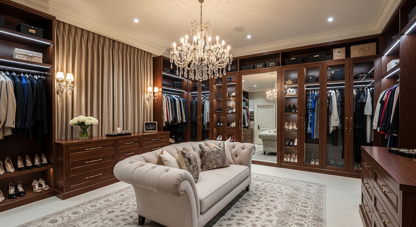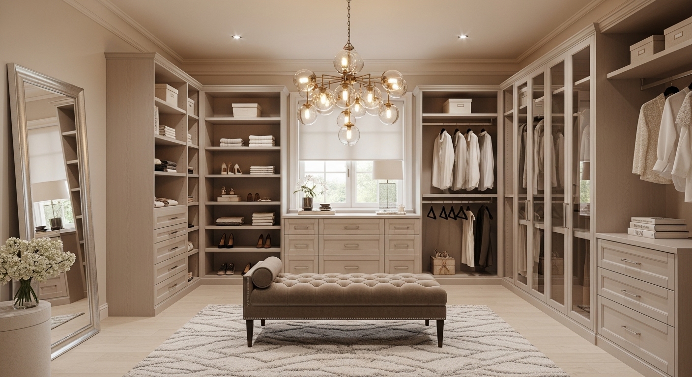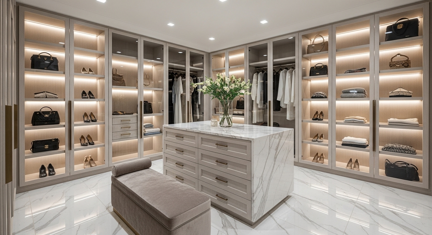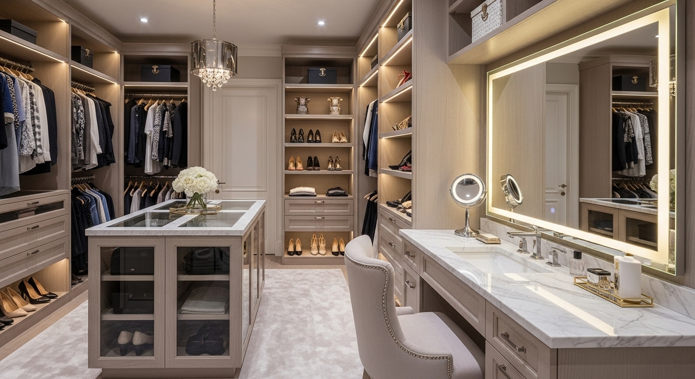Choose warm color temperatures (2700K–3000K) to flatter fabrics and skin tones. Use a central island finished in marble or lacquered wood, topped with a velvet tray for jewelry.