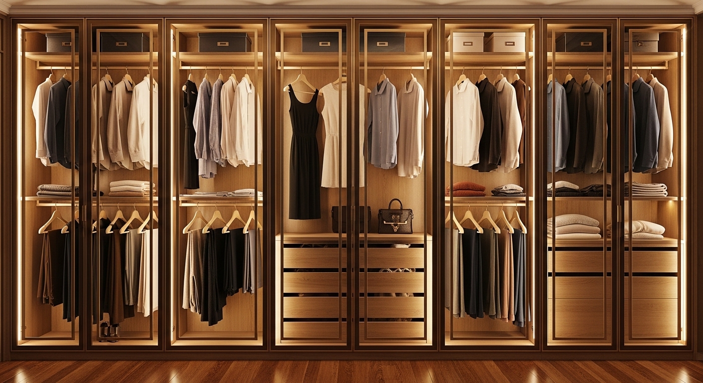 Glass-door closets bring boutique elegance and clarity to your dressing area. Use tinted, smoked, or fluted glass depending on your privacy preference. Behind the glass, warm strip lights highlight textures and silhouettes.