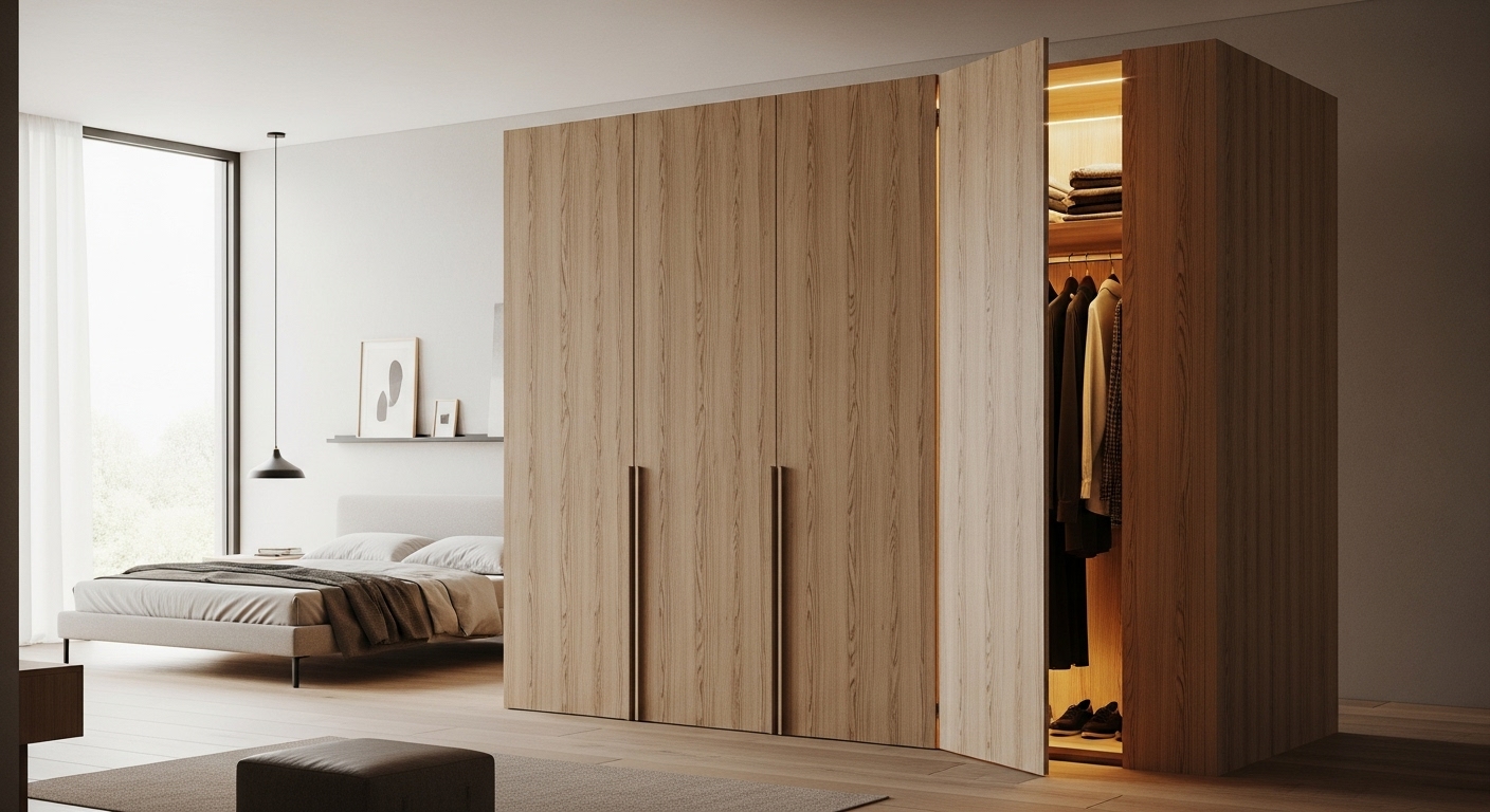 For those who favor minimalism, a hidden closet blends effortlessly into architectural walls. Use push-to-open panels without handles, finished in the same paint or veneer as the bedroom walls.