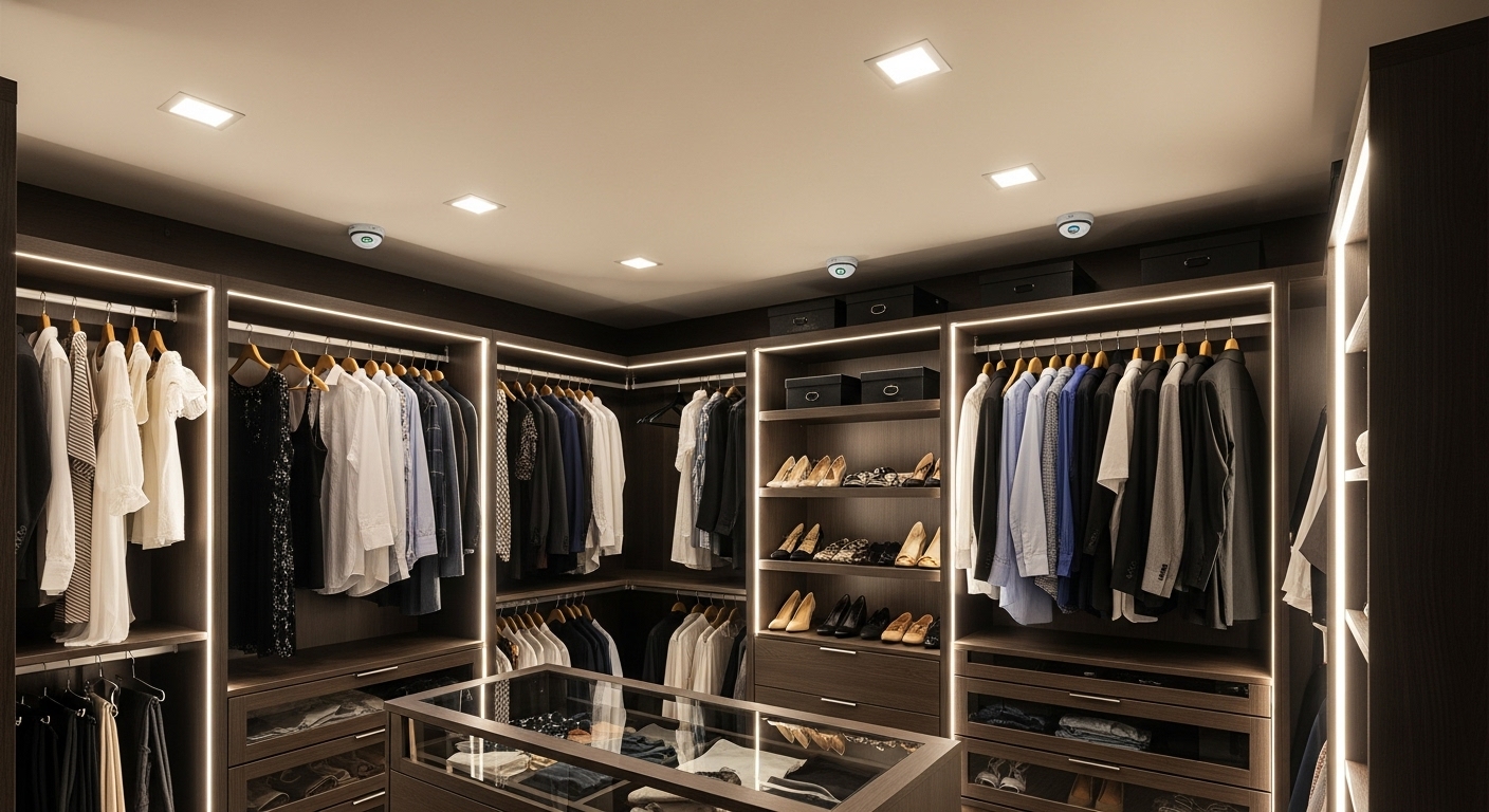 Smart LED systems with motion sensors or dimmers adjust automatically, making your closet energy-efficient and intuitive. Choose warm light for relaxing tones or daylight white for accurate color matching when dressing.