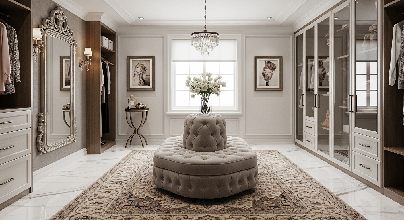 In larger closets, a seating zone enhances both luxury and function. A tufted ottoman or upholstered bench provides a place to put on shoes or set folded items. To elevate the look, use rich fabrics like velvet or leather. Layer a patterned rug beneath for warmth and definition. Add pendant lighting or a small chandelier for a glamorous touch.