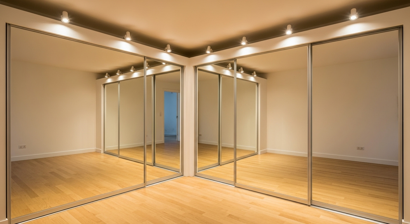 For functionality, include full-length panels that double as dressing mirrors. Add spotlights above to enhance reflection and illumination.