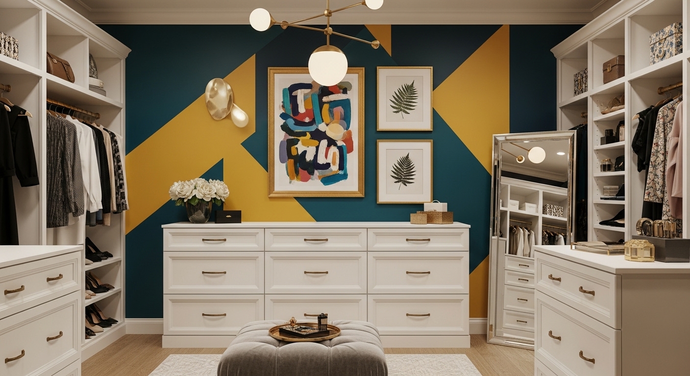 Turn your closet into a design statement. Paint the interior in bold hues like emerald, charcoal, or navy, or line the back walls with textured wallpaper. Add sculptural lighting or decorative handles in brass or crystal. A few framed art pieces or patterned boxes add an unexpected element of style.