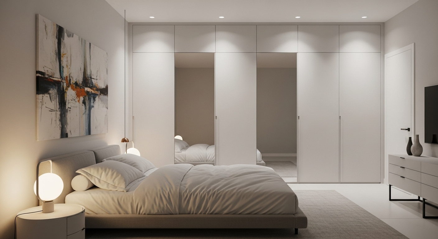A built-in wardrobe wall creates seamless elegance while saving space. Custom cabinetry can be flush with walls, creating the illusion of a continuous surface. Consider using handle-less panels or integrated grooves to maintain a sleek facade.