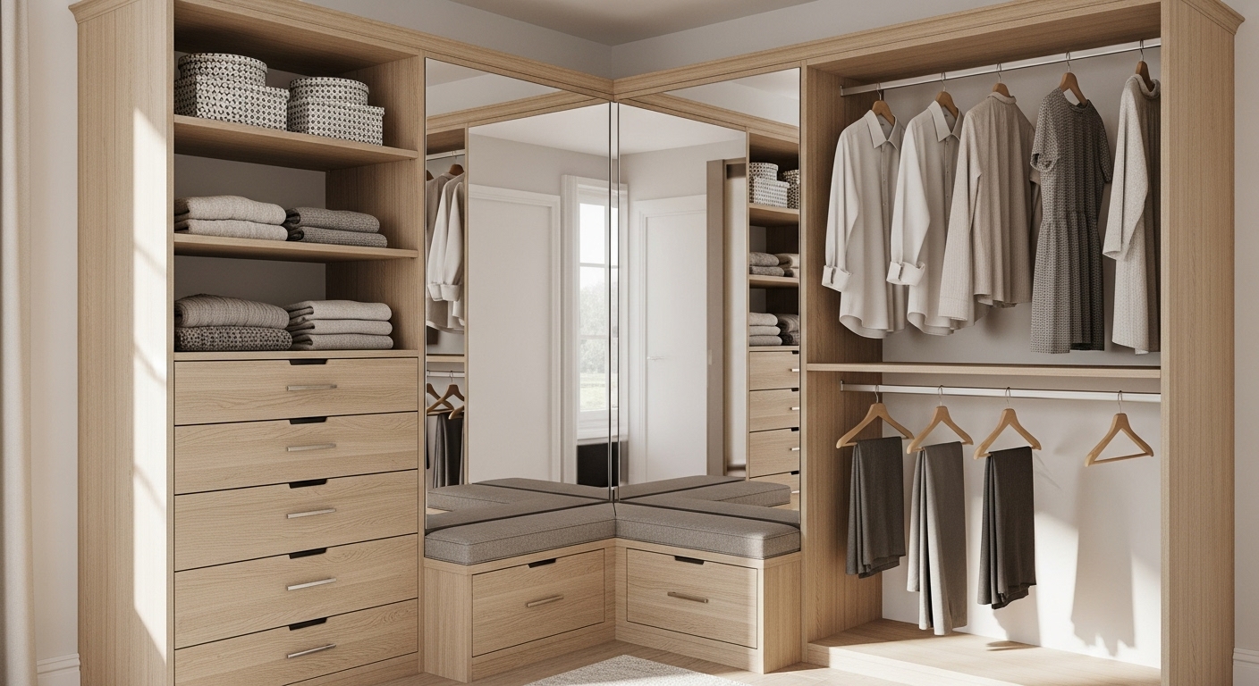 Make awkward corners work by installing custom cabinetry that wraps around the space. Use angled shelves, carousel racks, or corner drawers for efficiency. Mirrored panels in the corner can enhance natural light and make the space feel larger.