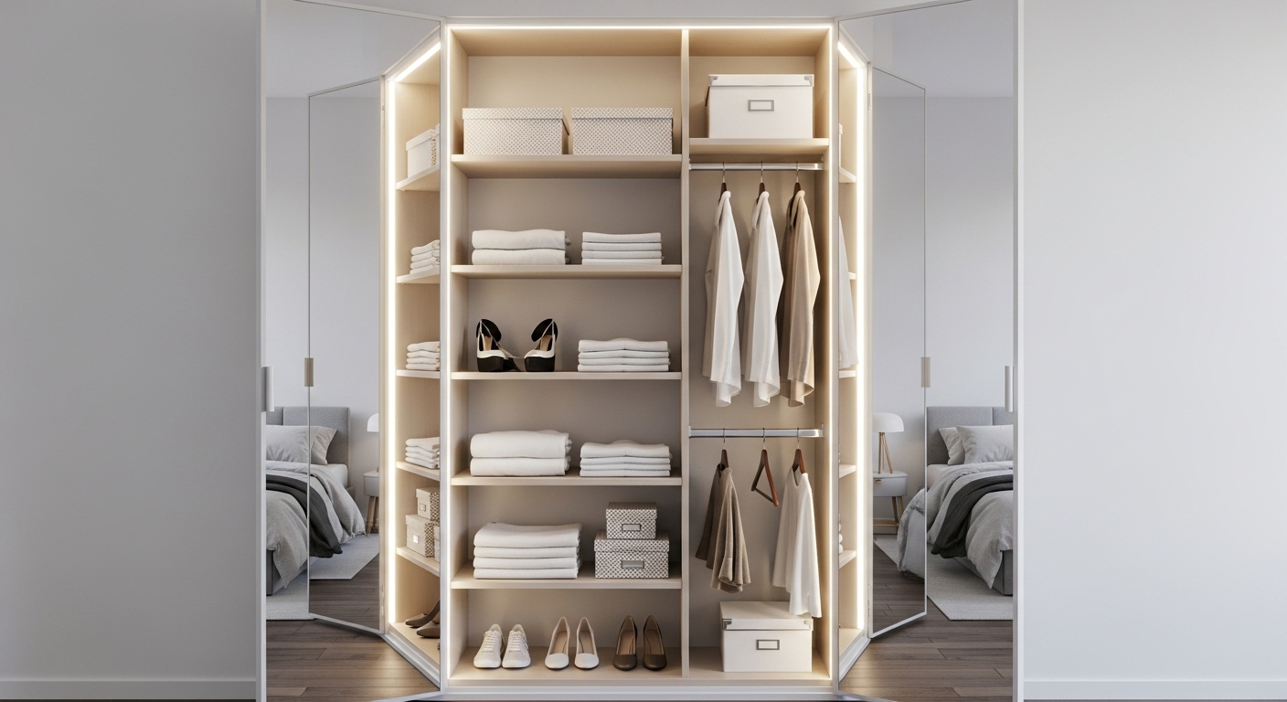 Even a small reach-in closet can feel grand with the right planning. Use vertical storage systems, double hanging rods, and slim drawers. Sliding or bifold mirrored doors save space while adding visual depth. Inside, LED strip lighting ensures every corner stays bright.