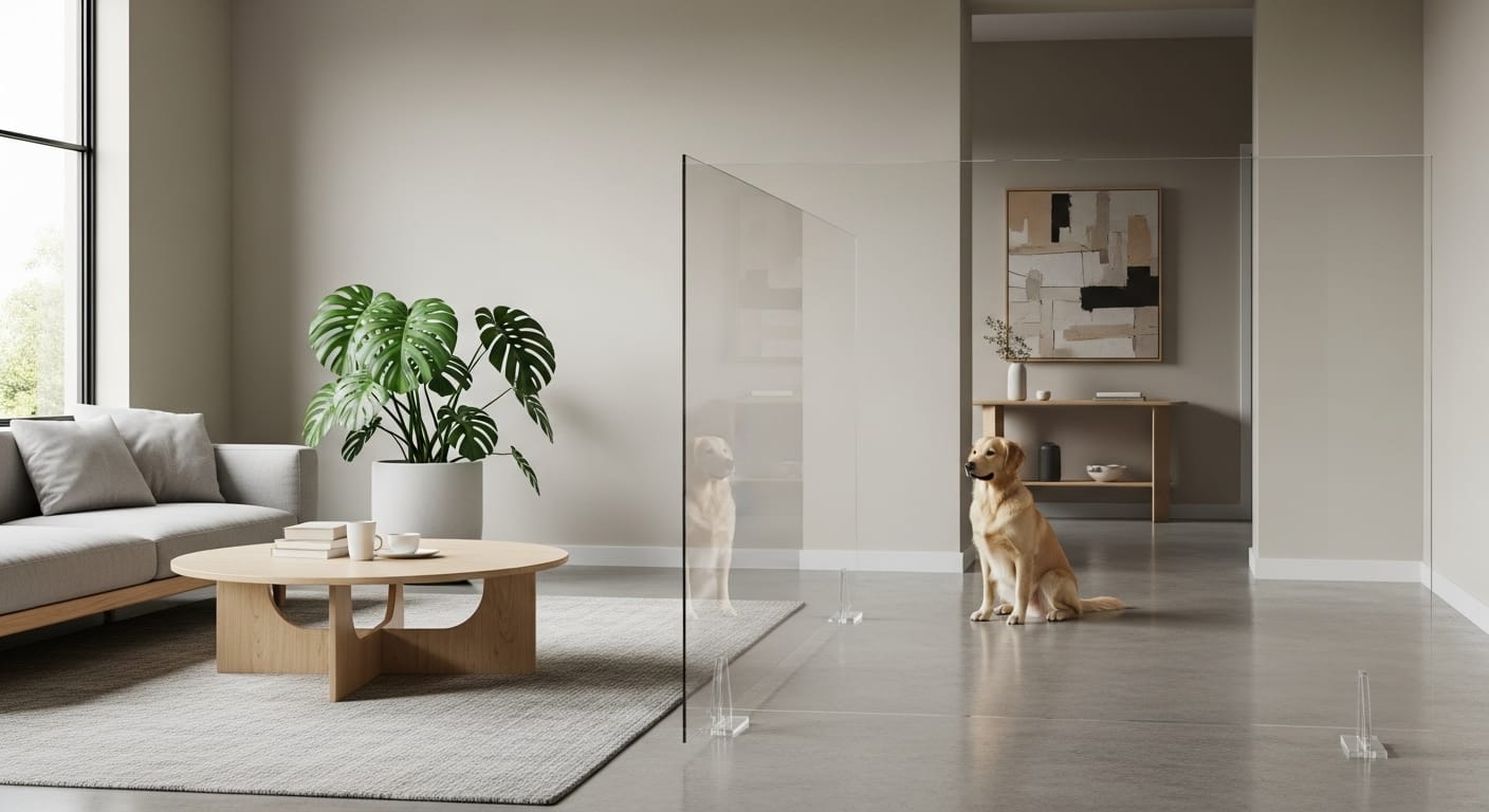 Picture a transparent, glass-like panel resting on a slim frame or mounted directly to the wall. The smooth surface reflects light, creating a clean, minimalist look. Your pet’s space is clearly defined, yet they can see everything happening around them, which can help reduce anxiety. The unobtrusive design makes the divider feel like an integrated part of the room rather than an afterthought. It is perfect for small apartments or modern homes that value simplicity.