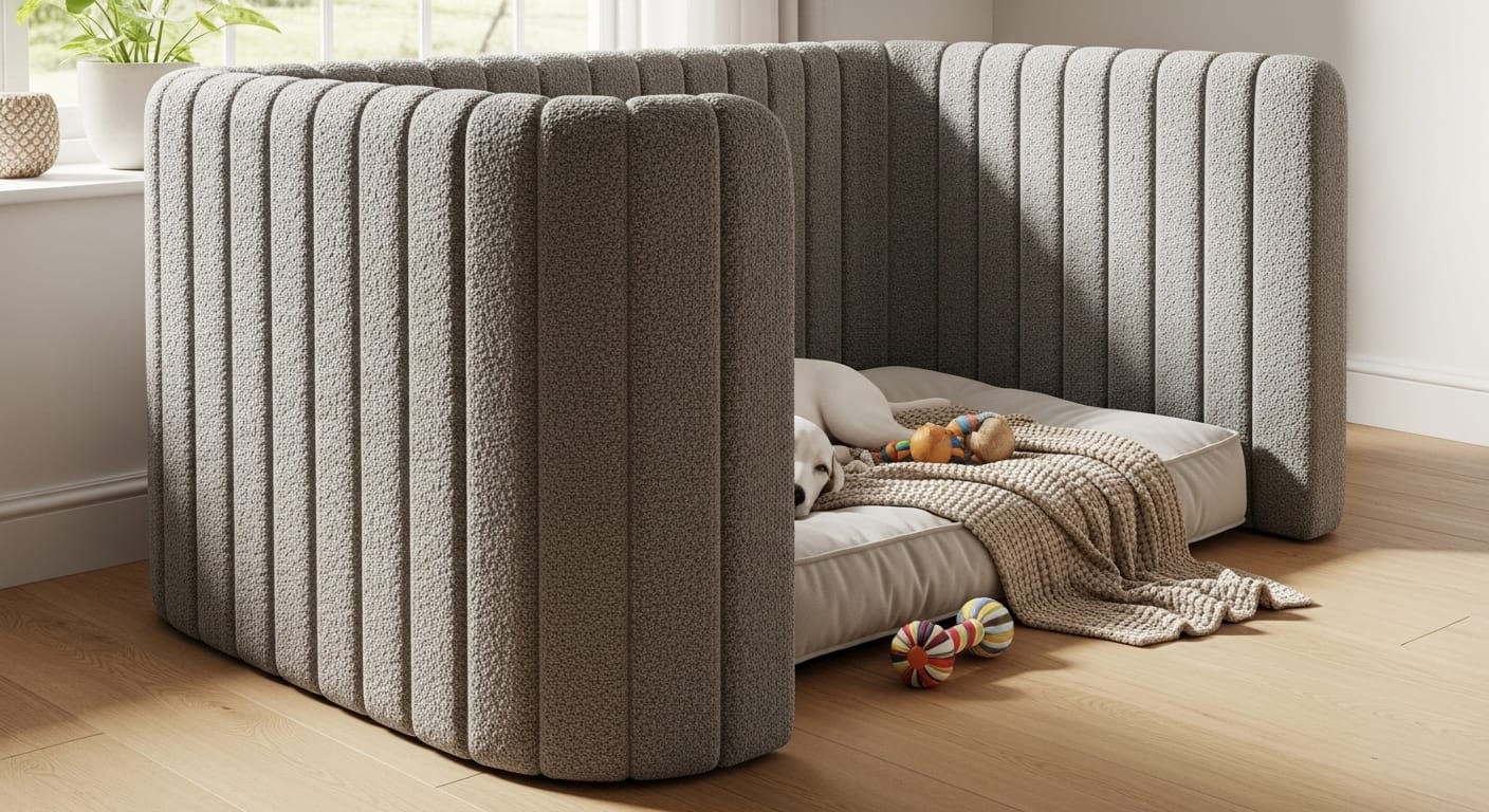 Visualize a fabric-covered frame with foam padding, creating a cushioned wall in your pet’s area. The fabric can be selected from a variety of textures, such as boucle, velvet, or quilted cotton, adding tactile richness. The panels are designed to be removable, attaching with zippers, snaps, or Velcro, which makes cleaning and swapping fabrics a simple process. The overall look is soft and inviting, with a touch of luxury that can elevate your space.