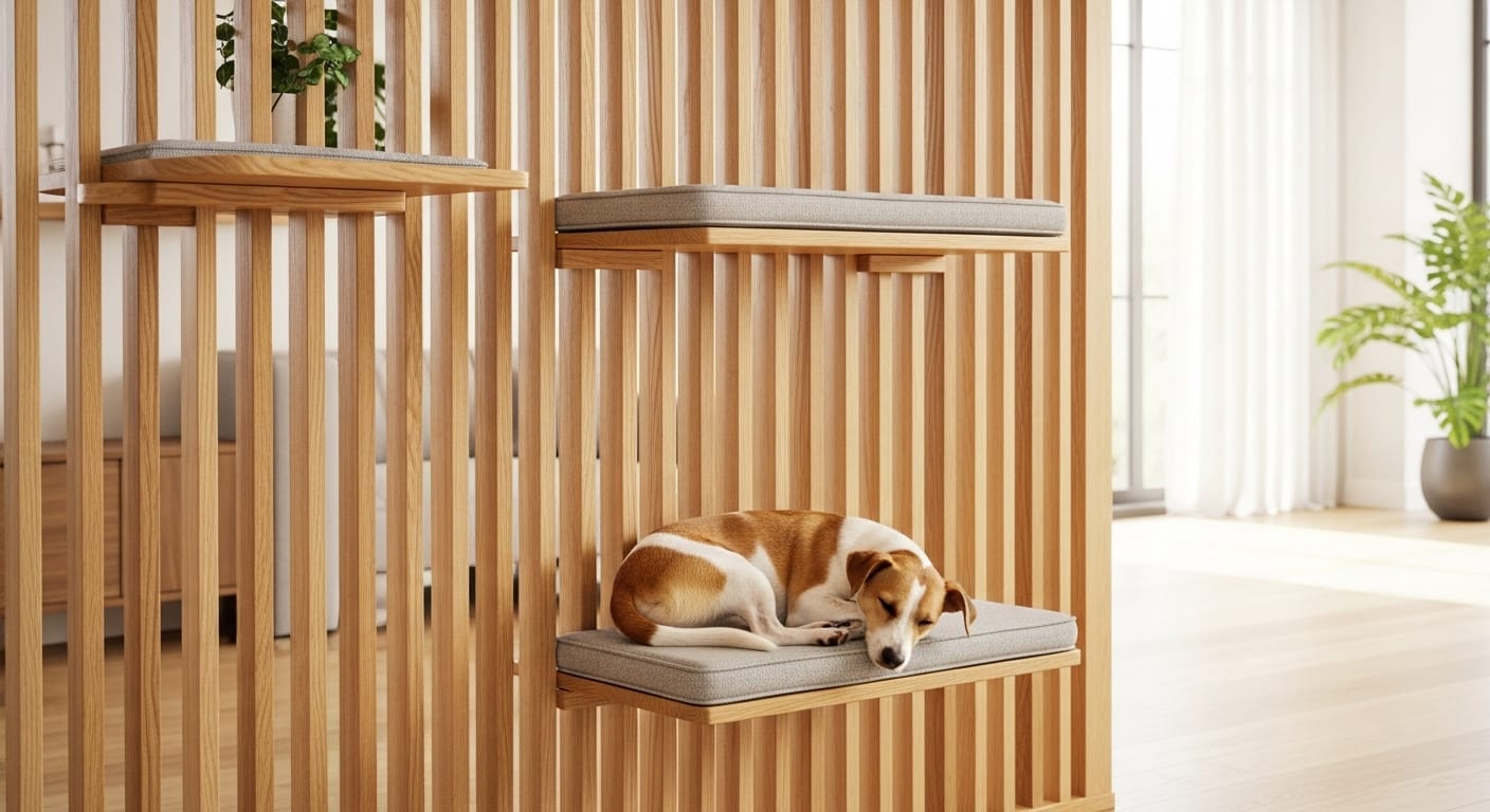 Visualize a frame constructed from natural or stained wood, with horizontal or vertical slats that form a semi-open wall. Small, sturdy pet perches are integrated into the structure at different heights, providing resting spots that blend seamlessly into the design. The open frame allows light and air to flow, preventing the space from feeling enclosed. Your dog can lounge on a perch, watch activities, or simply relax in a comfortable nook.
