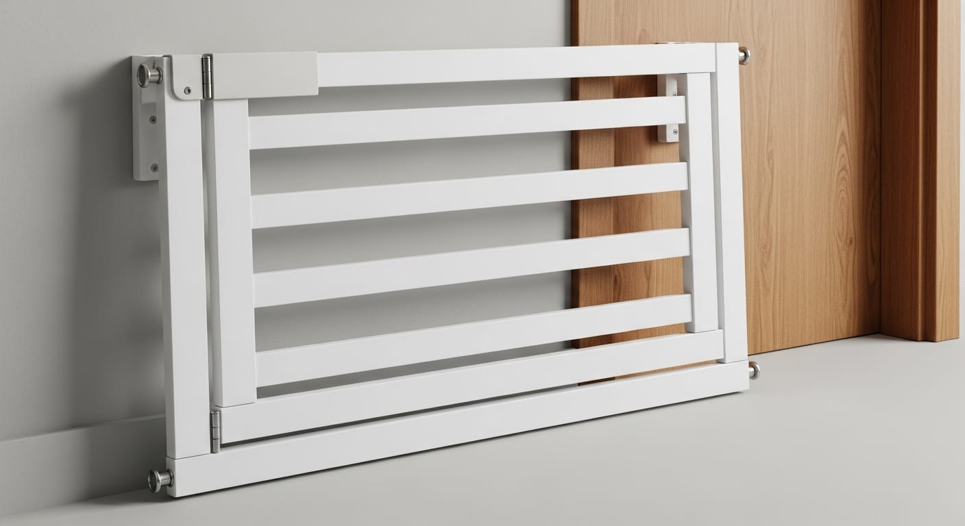 Visualize a sturdy gate, constructed from wood or metal, that is hinged to a wall. When in use, it extends to block a doorway or hallway. When no longer needed, it folds flat against the wall, remaining unobtrusive and out of the way. The design can be simple and functional or more decorative to match your home’s style. Finishes can range from natural wood stains to painted colors that complement your walls.