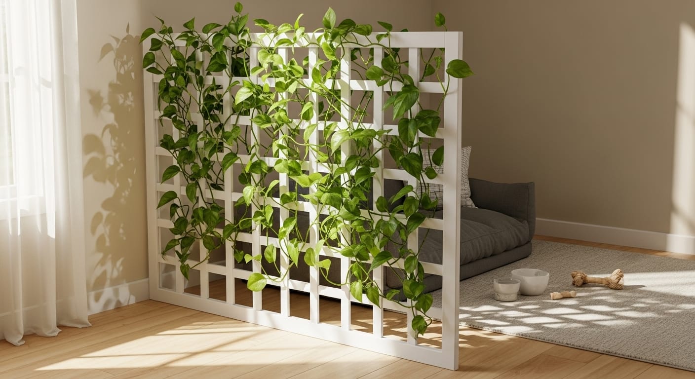 To add a touch of elegance and greenery to your pet’s space, a trellis panel offers a stylish way to define areas while supporting climbing, pet-safe plants or other decorative accents. This approach can give your room a garden-like feel while effectively containing your furry friend.