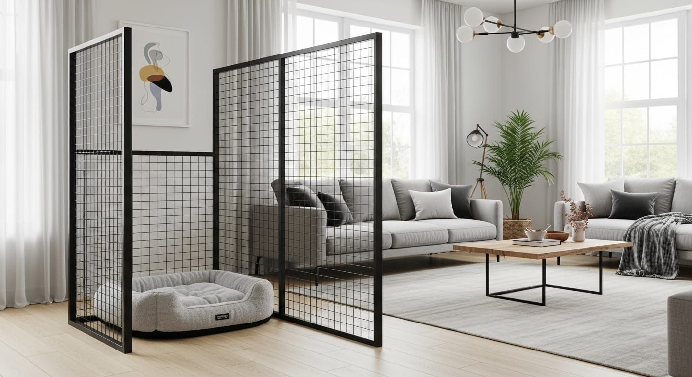 Picture a minimalist metal frame, painted in matte black or brushed nickel, with a fine wire mesh stretched tautly across it. The open design allows sunlight to pass through freely and gives your pet a clear line of sight to the rest of the room. You can observe your dog resting comfortably while the airy structure prevents them from wandering into restricted areas. The overall look is modern, clean, and unobtrusive, blending seamlessly with contemporary decor.