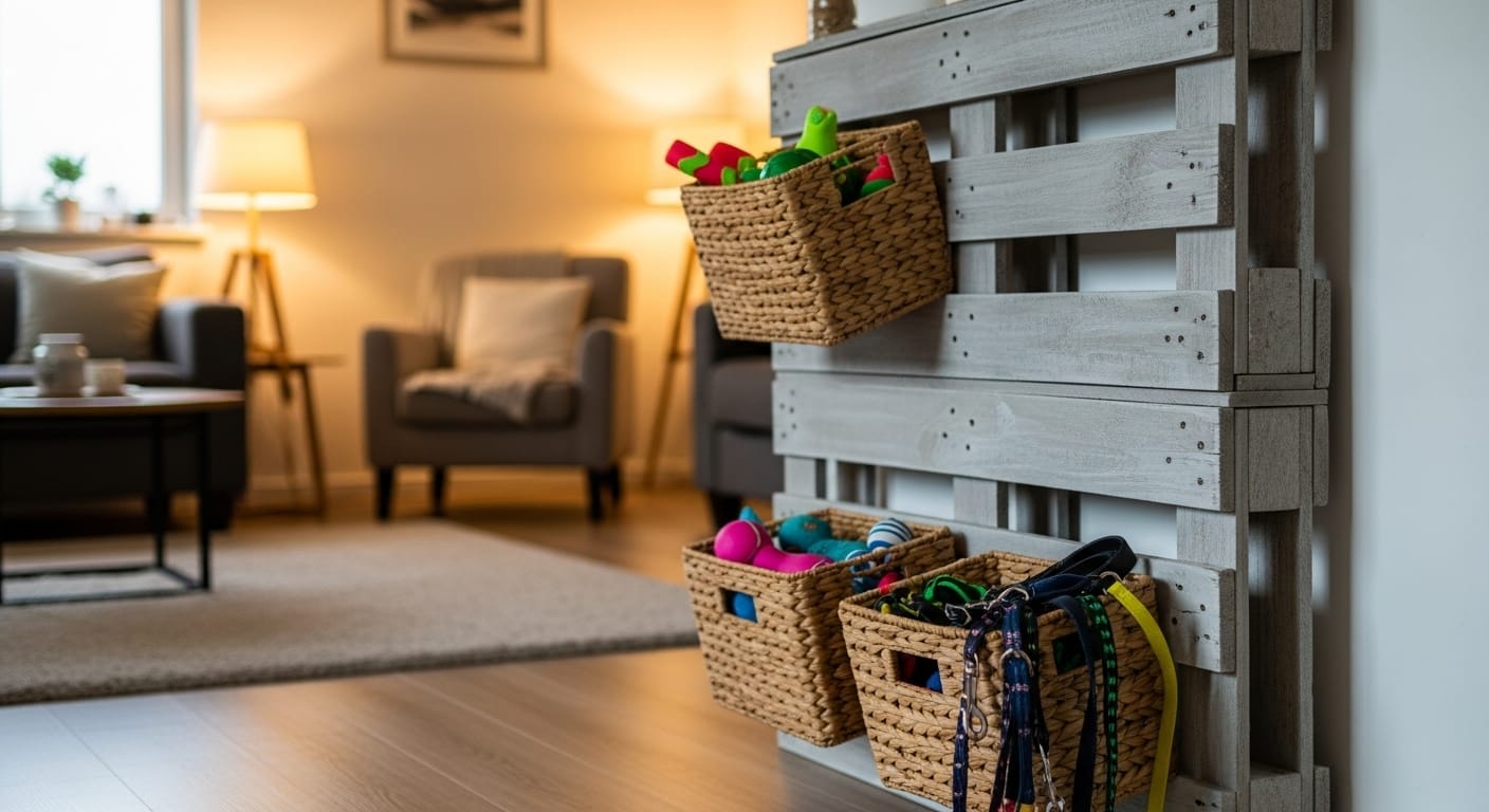 Imagine a sturdy, weathered wooden pallet painted in soft, neutral colors and positioned against a wall, with woven baskets fitted into its openings. These baskets can hold toys, grooming tools, and other essentials, keeping them neatly organized and accessible. The rough texture of the reclaimed wood adds rustic warmth, while the contents of the baskets can add a splash of color. The overall appearance is inviting, functional, and effortlessly stylish.