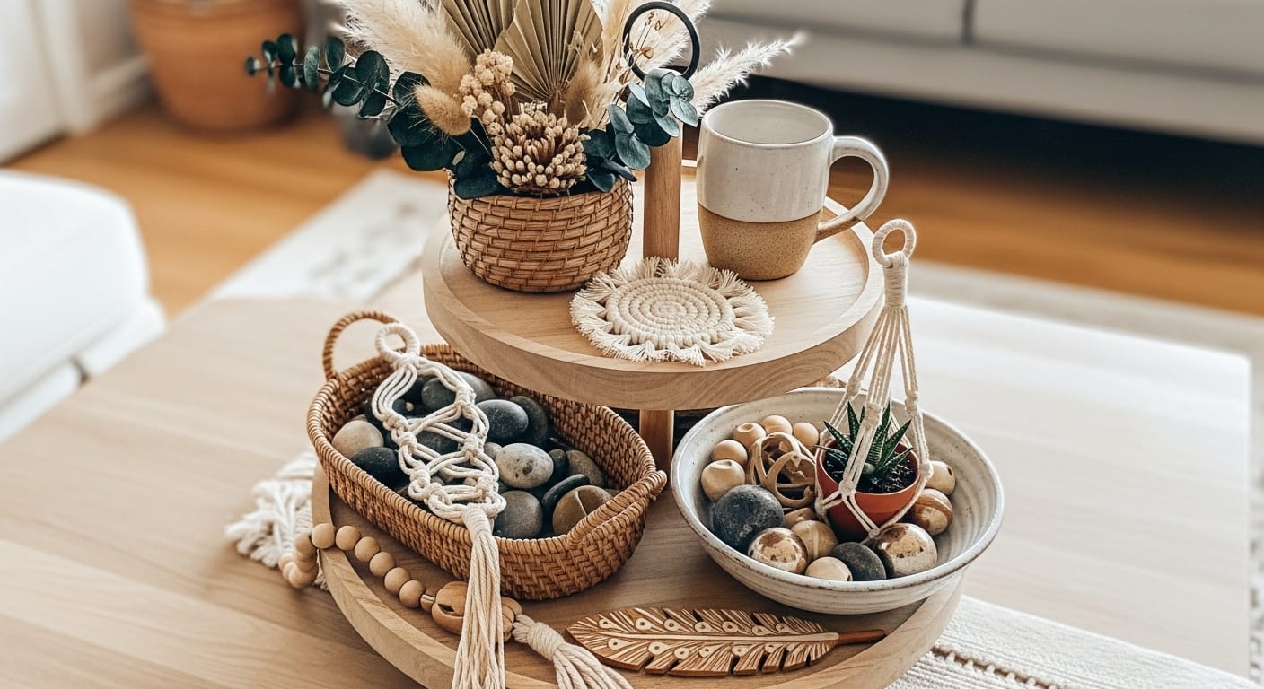 Mix textures—matte ceramics with glossy metals, rough wood with smooth textiles—and incorporate small decorative natural elements like driftwood or stones. Personalize with handcrafted items like beaded garlands or painted wooden signs.
