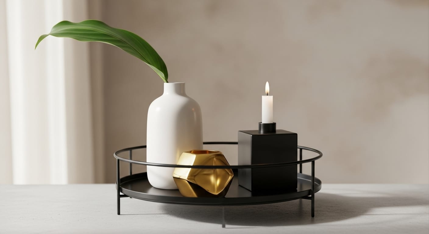 Incorporate smooth ceramics, matte finishes, and metallic textures for contrast. Use symmetry or asymmetry to achieve visual balance, and adjust materials—matte vs. glossy or rough vs. smooth—for depth. Highlight a few statement pieces in small spaces or multiple smaller items on larger trays.