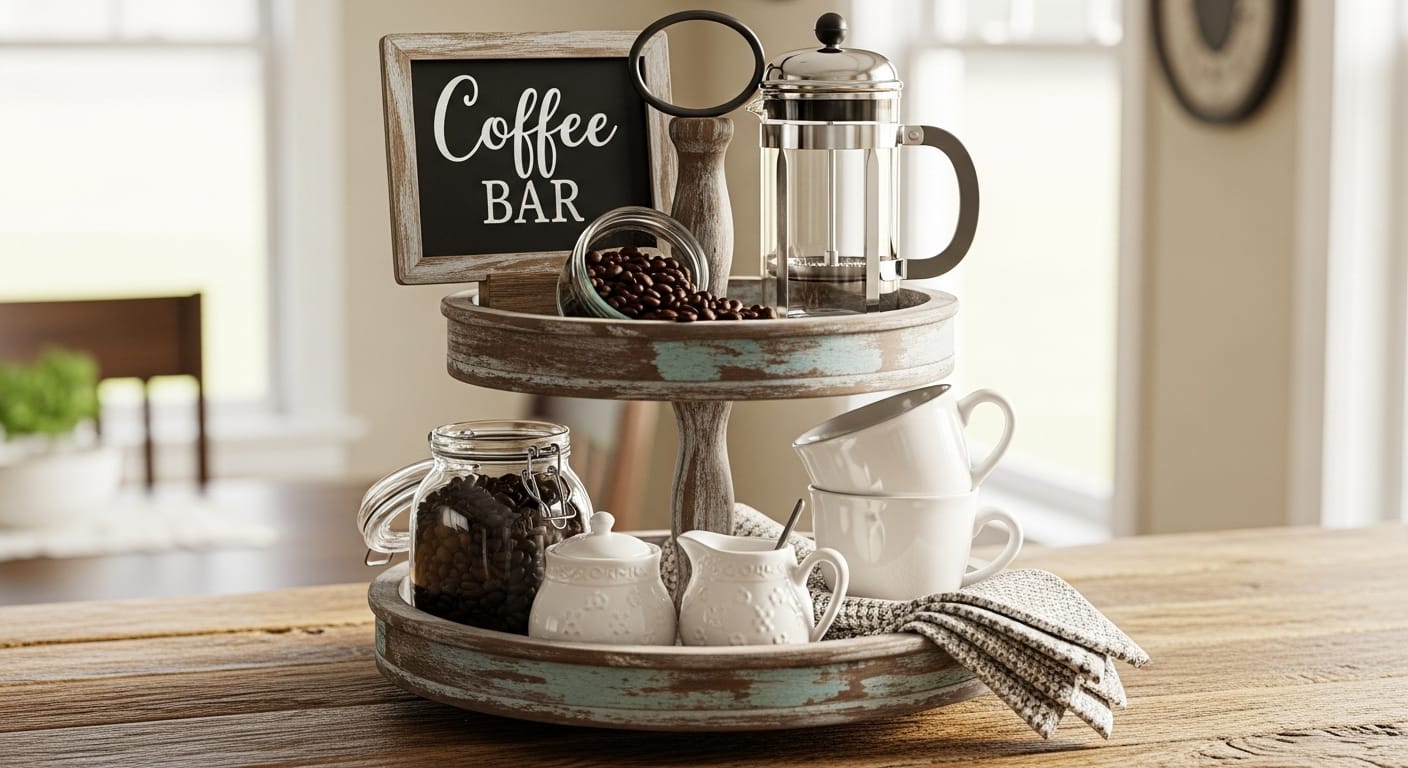 To create a warm, inviting corner dedicated to your daily caffeine routine, a coffee and tea station on your tiered tray can form a cozy, functional display that feels like a mini cafe at home. This idea is perfect for morning rituals or afternoon conversations and adds a personal touch to your decor.