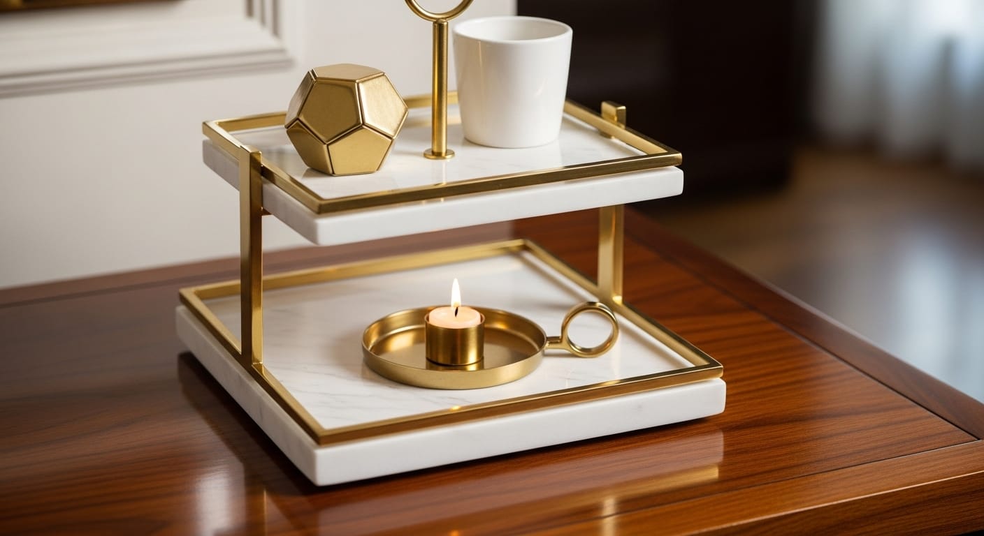 For a high-end, luxurious vibe that transforms your space into a stylish haven, marble and metallic accents can elevate your tiered tray with a refined, sophisticated look. This style is perfect for creating an upscale focal point that impresses guests and boosts your decor confidence. It is also surprisingly easy to incorporate with the right pieces.