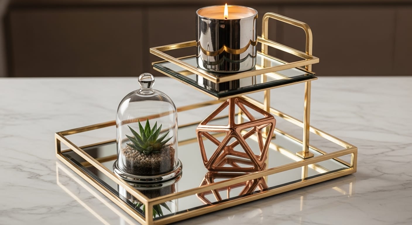 Imagine clear glass cloches, metallic trays, and shiny ceramics paired with reflective surfaces. The scene gleams with silver, gold, or rose gold accents, catching and bouncing light across your space. Incorporate geometric glass pieces or minimalist metallic sculptures for a high-end feel. The overall look is clean, polished, and eye-catching, making it ideal for a modern aesthetic.