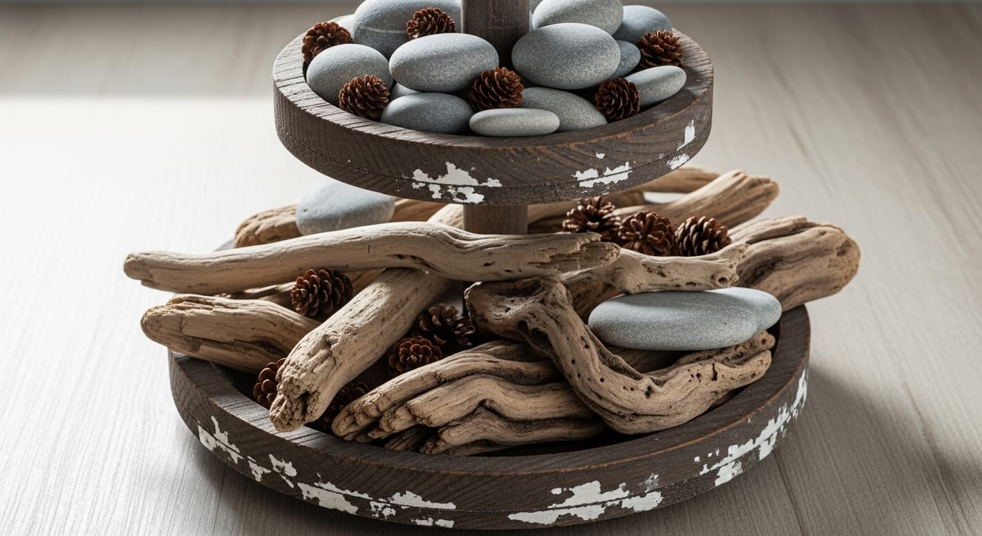 For a natural, earthy vibe that grounds your space, nature-inspired decor featuring driftwood and stones can bring a calming, organic feel to your tiered tray. This style is perfect for creating a zen-like retreat at home that feels connected to the outdoors and is an affordable way to add texture and interest.