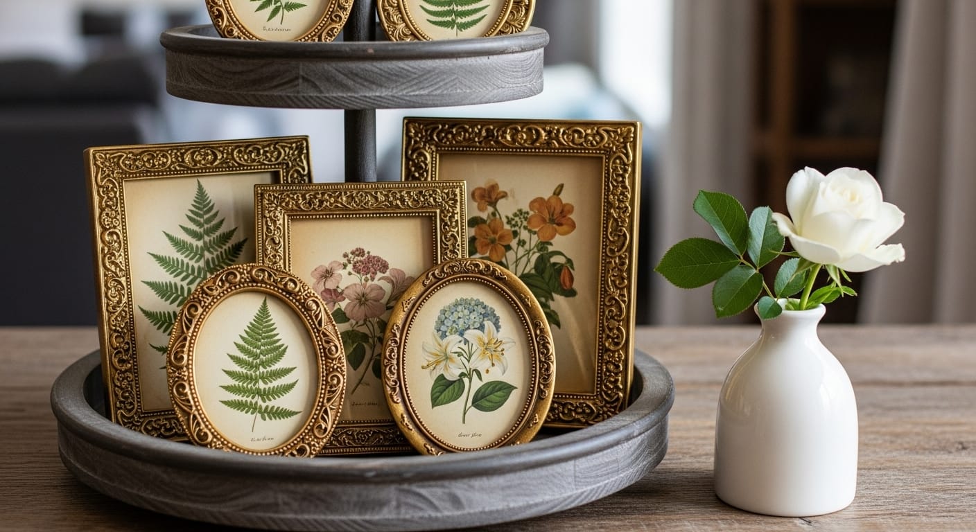 To add a touch of old-world charm and intellectual sophistication, vintage botanical prints and frames can elevate your tiered tray with classic elegance. This style is ideal for nature lovers and history enthusiasts who desire decor that tells a story. It is also an excellent way to incorporate art into your space without being overwhelming.