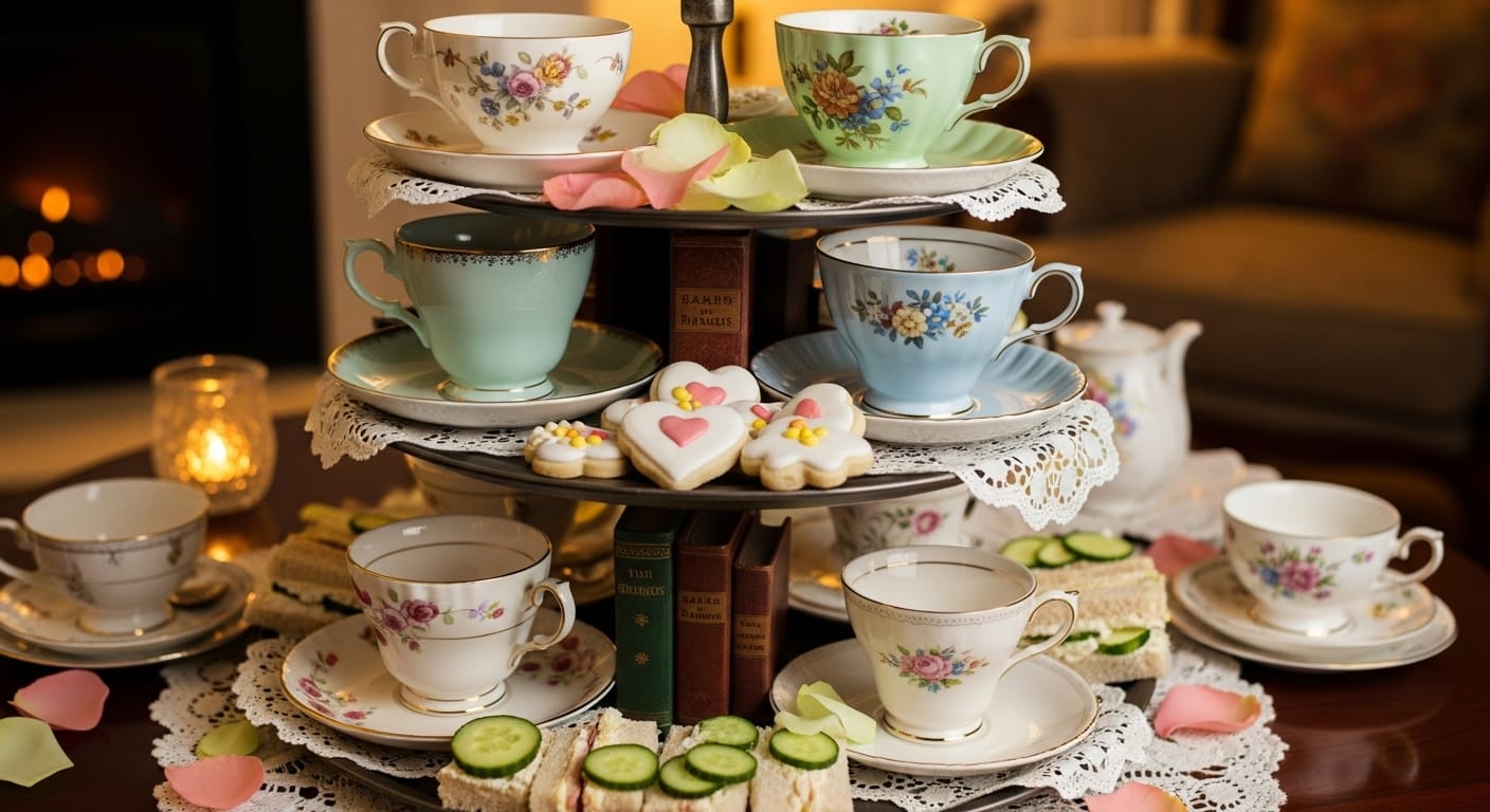Invoke nostalgia and charm with a vintage tea party display. Antique teacups, saucers, lace doilies, and small weathered books evoke a whimsical and elegant atmosphere perfect for everyday decor or special occasions.