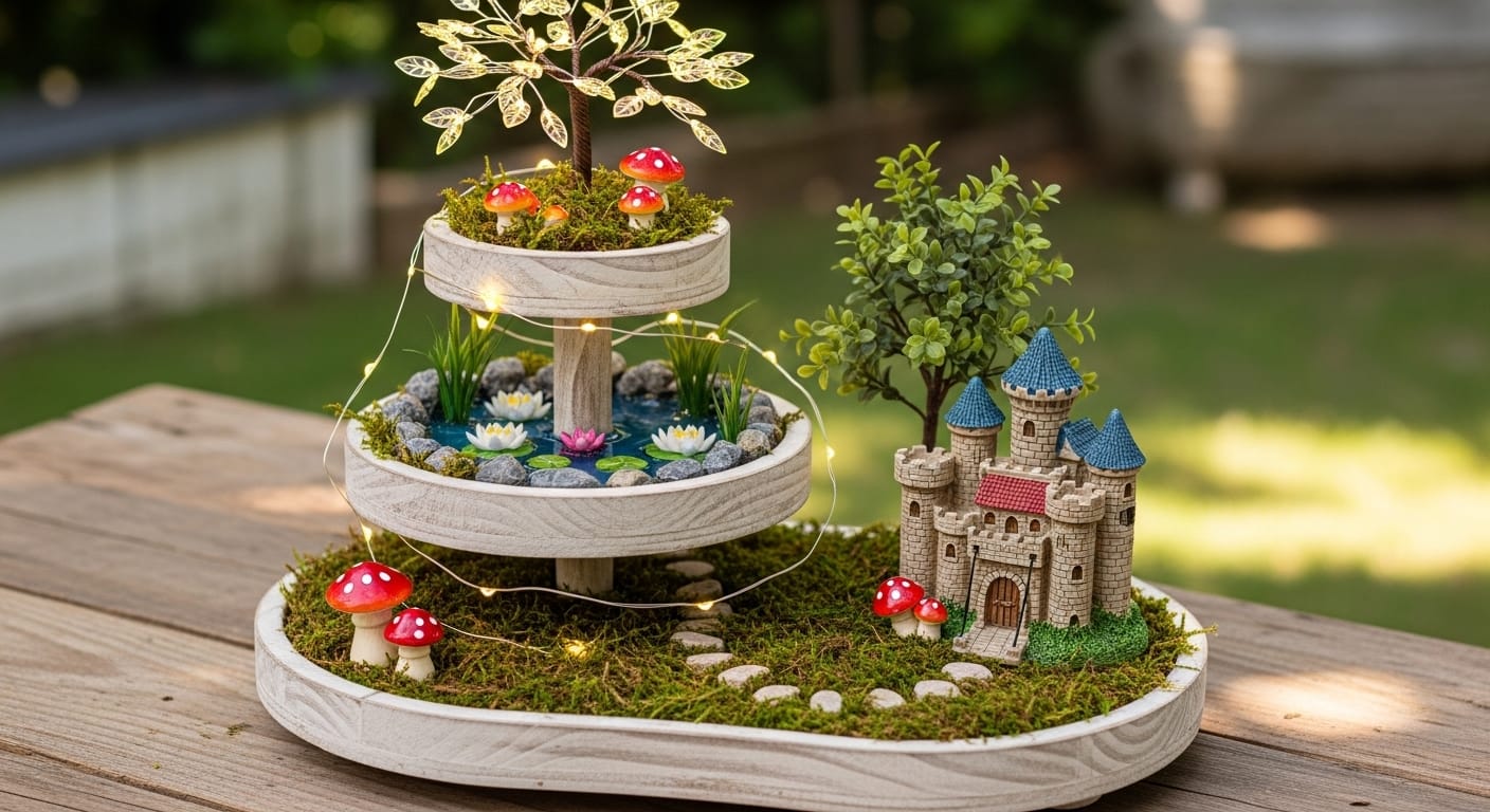 Collect miniature castles, fairy figurines, and fairy lights from craft stores or online retailers. Arrange them on different levels using risers or small boxes to create a layered, magical landscape. Add faux moss or glitter to enhance the enchanted forest feel. Incorporate pastel ceramics or decorative stones to complement the scene. Maintain a balanced composition, avoiding overcrowding, and periodically add new whimsical elements to keep the display fresh.
