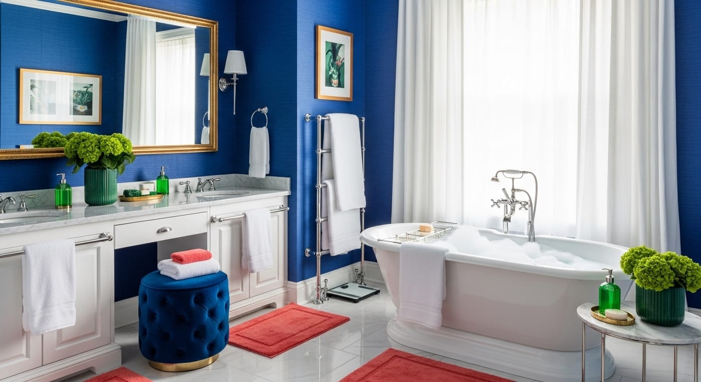 Add deep red or gold accents, layer textiles, and use warm metallic fixtures. Maintain minimal decor for a soothing, indulgent bathroom.