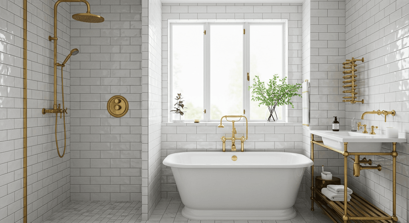 White tiles with black grout provide a perfect canvas for metallic accents. Together, they create a look that’s bold, modern, and undeniably luxurious. Picture glossy white tiles outlined in black grout, complemented by brass, chrome, or matte black fixtures. The interplay of contrast and shine builds an atmosphere of high-end sophistication.