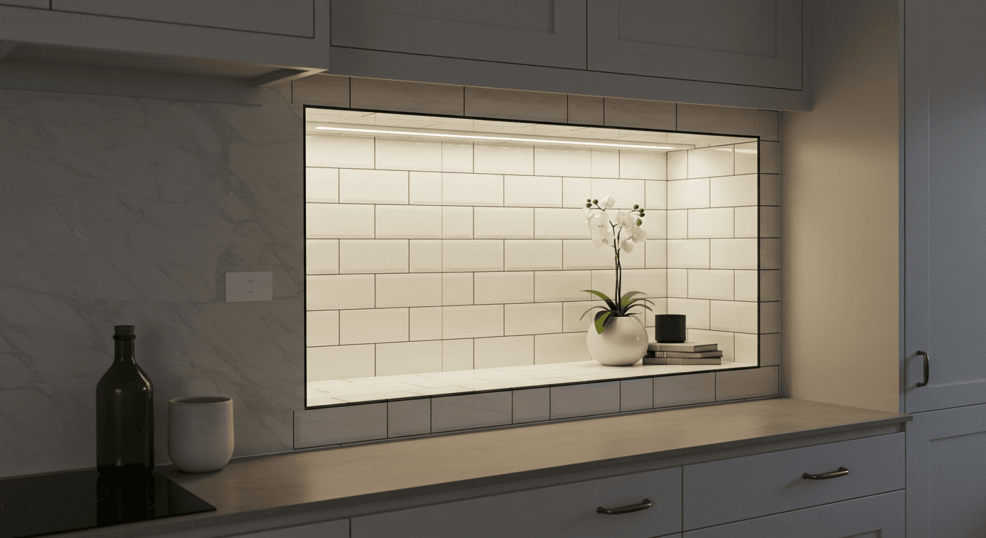 You can use varying tile finishes for texture and depth. Add LED lighting underneath for a subtle glow. Ideal in bathrooms, kitchens, or living areas, it balances form and function beautifully. Mount tiles precisely on a reinforced surface with hidden brackets. Apply black grout evenly, seal to resist moisture, and maintain regularly for a crisp appearance.