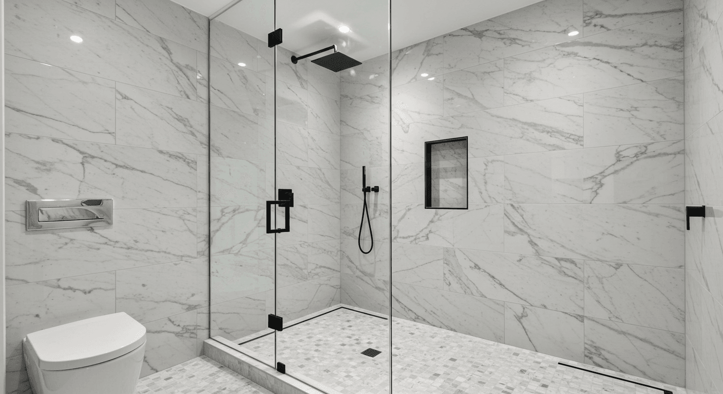 Imagine a transparent glass shower where the white tiled walls and floor are sharply outlined by black grout. The lack of a metal frame makes the tiled surface the star of the show, emphasizing the clean lines and dramatic contrast. It creates an uncluttered, expansive environment that turns your daily shower into a luxurious retreat.
