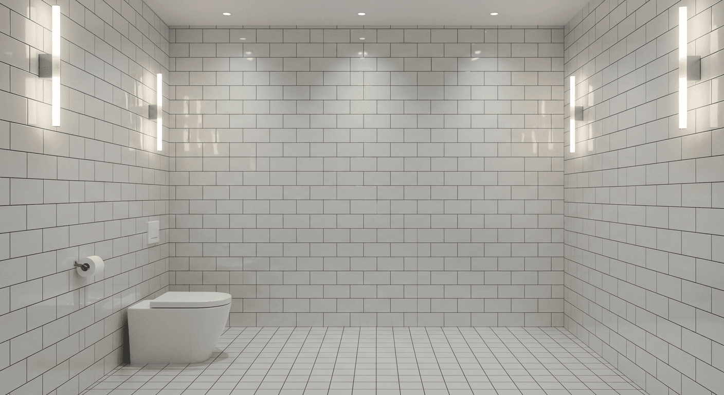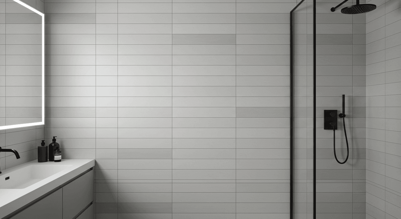 If you’re over busy patterns and crave a streamlined, ultra-modern look, large-format white tiles with thin black grout lines are your go-to. This style is perfect for making any space feel bigger, cleaner, and more open. The minimal grout lines trick the eye, creating the illusion of a continuous, seamless surface.