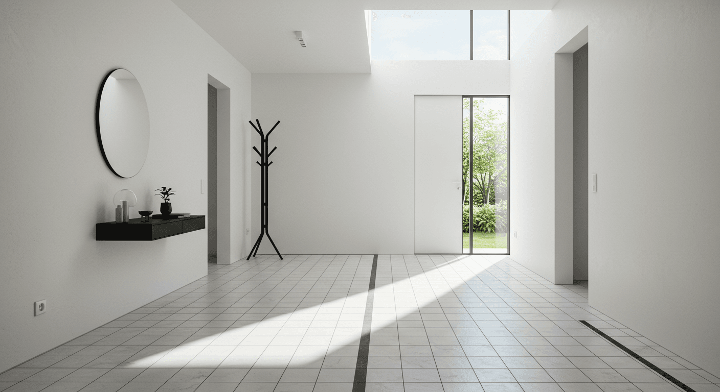 To make a lasting impression from the moment guests arrive, white floor tiles paired with black grout create an entryway that feels bold, elegant, and architectural. Picture a spacious foyer with glossy white tiles arranged in a grid, each separated by precise black grout lines. The contrast defines the floor, reflecting light and giving a sense of grandeur.