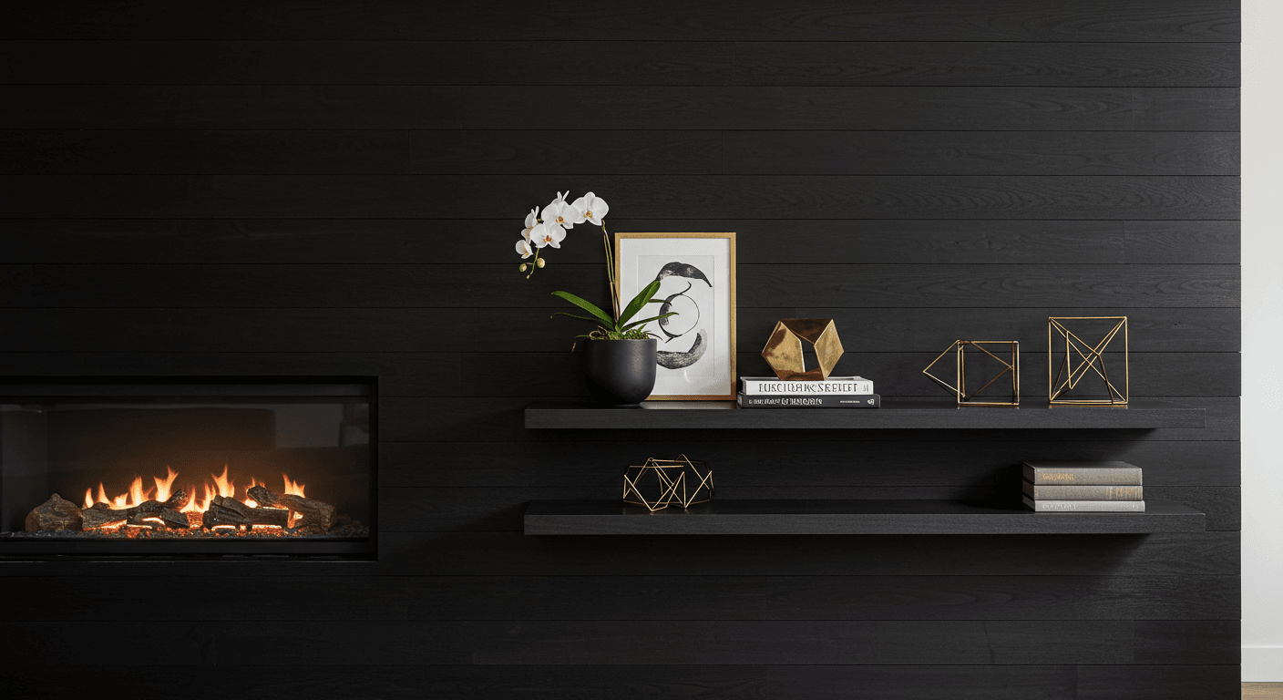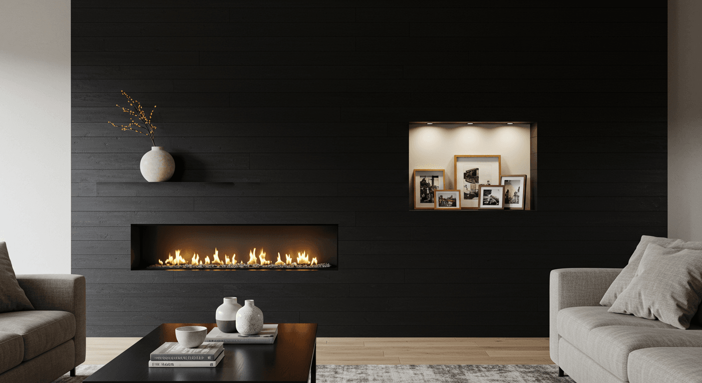 A black shiplap wall with a built-in niche allows you to showcase decorative items while maintaining a clean aesthetic. Recessed niches create depth and visual interest without cluttering the space. Add sculptural objects, candles, or bowls for a gallery-like effect, enhanced by soft, focused lighting. Suitable for minimalist or eclectic interiors, niches can vary in size depending on your display needs. Install panels carefully and frame the niche with trim, adding recessed lighting or LED spots for emphasis. Personalize with ceramics, collectibles, or seasonal décor to elevate the fireplace into a sophisticated focal point.