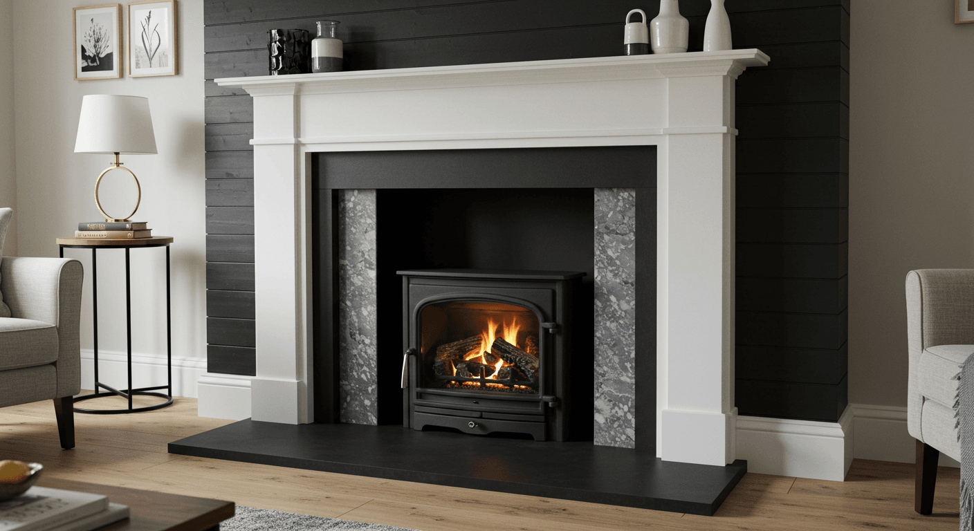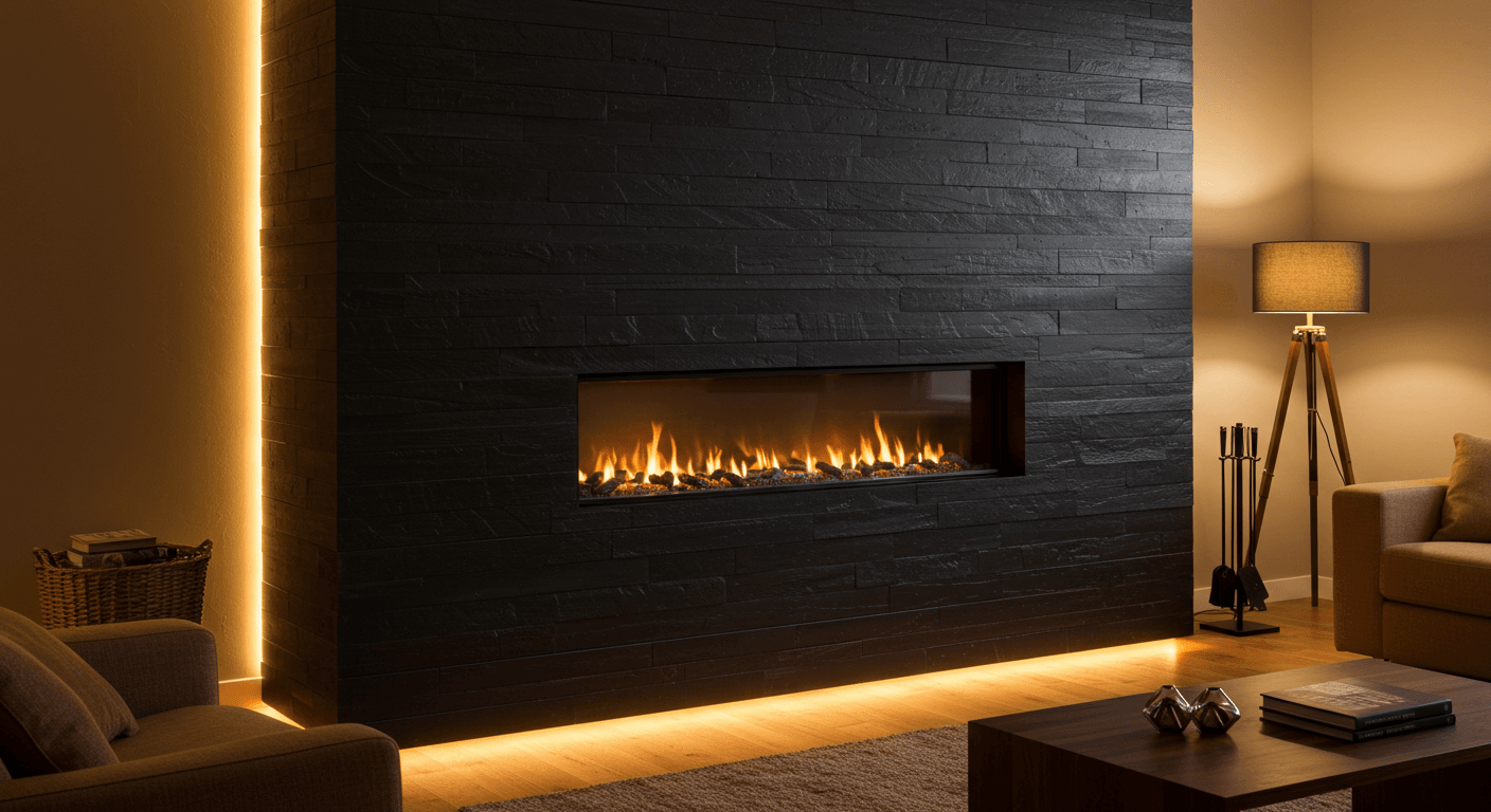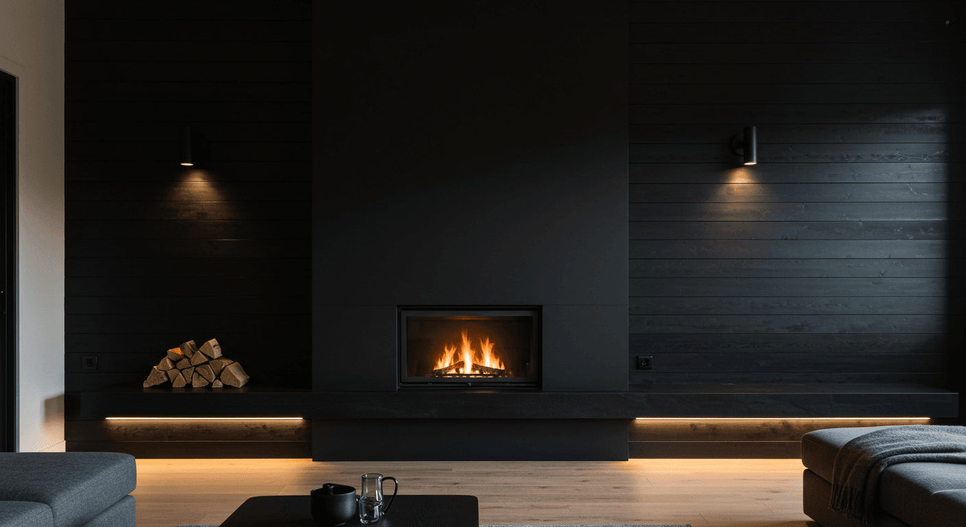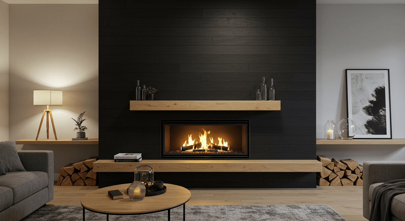For a bold, immersive statement, cover your fireplace wall with matte black shiplap and pair it with a matching black surround. This creates a seamless, unified look where the fireplace blends elegantly into the wall while still standing out. The monochrome palette emphasizes texture and line, and subtle lighting or a flickering flame adds warmth and depth. Ideal for minimalist, contemporary, or ultra-modern interiors, this design can be softened with textured textiles, layered rugs, or understated metallic accents. Install continuous panels with quality adhesive and secure nails as needed. Finish with matte black paint or stain, and add concealed lighting for extra effect. Curate décor like geometric sculptures or layered textiles to maintain a sleek, uncluttered aesthetic.