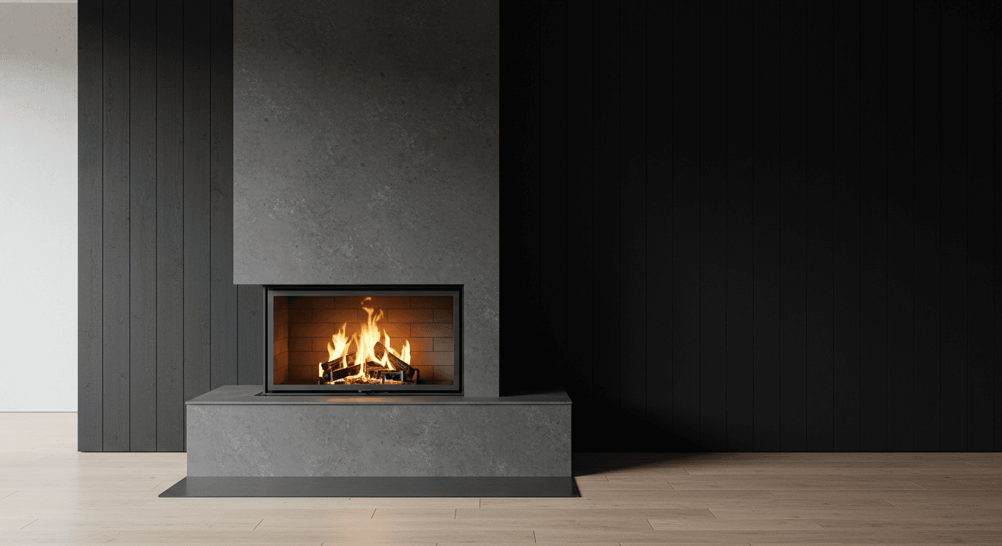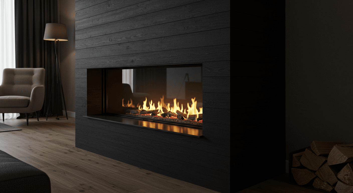 Combine safety with style by integrating a flush-mounted fireplace insert behind a glass or metal screen within a black shiplap wall. The reflective glass enhances depth while keeping the design streamlined and clutter-free. Suitable for modern, minimalist, or industrial interiors, this setup highlights the fire while concealing functional elements. Install a flush-mounted insert, attach panels around it, and seal gaps with heat-resistant material. Personalize with sleek black tools, minimal décor, or patterned glass for a subtle decorative touch. This solution delivers a seamless, elegant fireplace that balances functionality and sophistication.