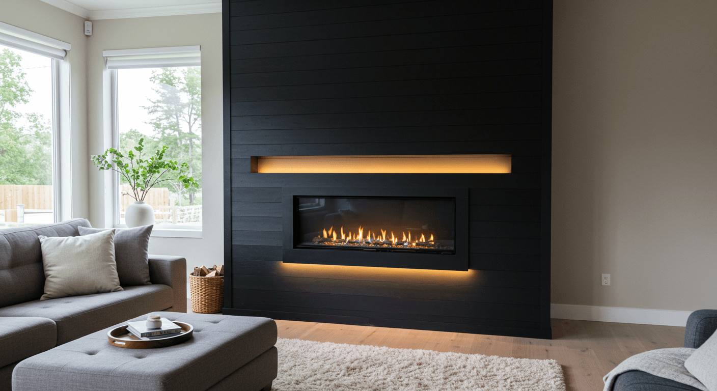 Integrated LED lighting behind black shiplap adds a subtle, inviting glow. Hidden strips create ambient lighting that highlights textures and provides mood-setting versatility. Adjustable brightness allows you to shift between bright and cozy illumination. This approach suits modern and transitional interiors. Plan wiring safely, install LED strips discretely, and pair with textured textiles or soft furnishings. Smart controls or dimmers enhance convenience. This lighting design transforms a functional fireplace into an atmospheric centerpiece.