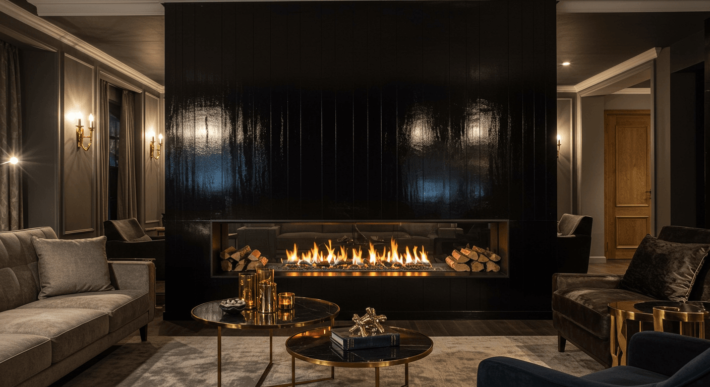 For a bold, glamorous look, high-gloss black shiplap turns any fireplace into a showstopper. The reflective surface adds depth and luxury, instantly elevating the room. Pair it with metallic accents and sleek lighting to enhance sophistication. This approach works well in modern luxe interiors but can be softened with plush textiles for a welcoming touch. Install high-gloss panels with adhesive and finishing nails, ensuring a smooth, even surface. Complement the finish with a matching black mantel and optional LED strip lighting for luminous effects. Decorate with metallic accessories, plush textiles, and artful mirrors to amplify the glamour. This style is perfect for those who want a dramatic, upscale focal point.