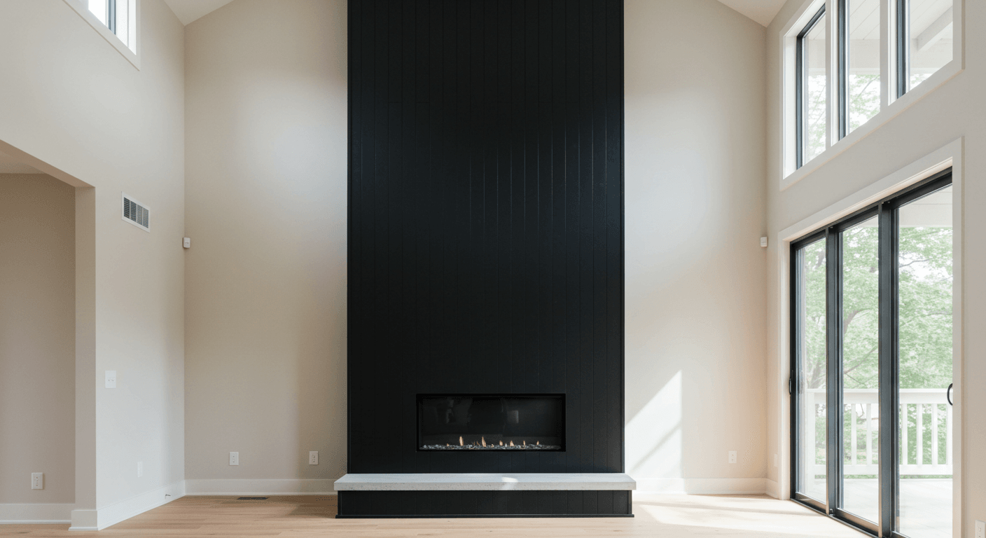 A tall, narrow fireplace opening framed by black shiplap draws the eye upward, creating a dramatic vertical focal point. Perfect for rooms with high ceilings or minimalist décor, this design emphasizes height and modern elegance. The black surface absorbs ambient light, making flames or fire glass stand out. Customize with sculptural fire features or minimalist décor above. Install panels flush around the opening, use trim for clean edges, and add accent lighting to enhance verticality. This sleek design makes a striking, architectural statement.