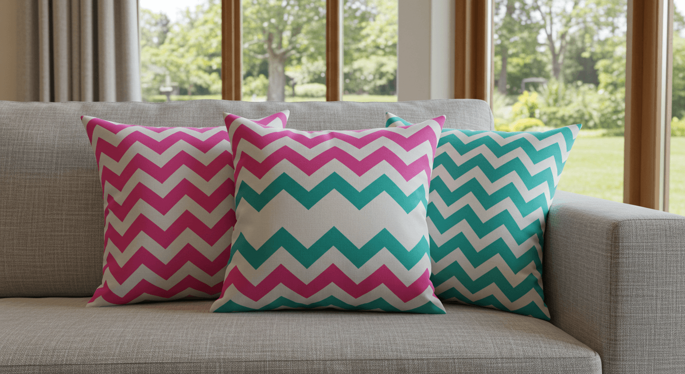 Visualize a set of fabric pillow covers in a neutral base color, each featuring bold chevron stripes in contrasting bright shades like pink and teal. The fabric is smooth and durable, suitable for daily use. When placed on a sofa, they create a vibrant, contemporary appearance. The zigzag pattern introduces a sense of visual movement, making the space feel more dynamic and modern.
