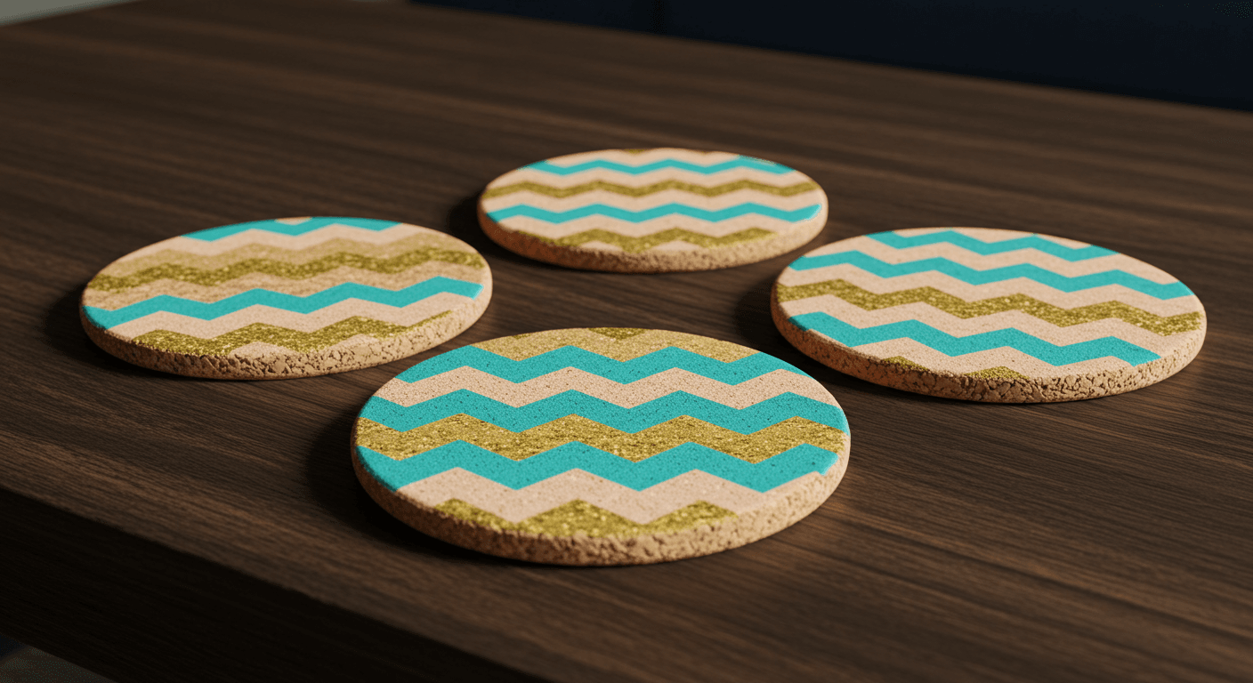 Imagine a set of round cork coasters painted with bright, zigzag chevron stripes in shades like turquoise, gold, and blush pink. A glossy finish enhances the bold design and helps prevent water rings. When stacked or arranged on a table, they provide a pop of color and personality. The pattern’s sharp lines and vibrant hues transform ordinary coasters into eye-catching accents.