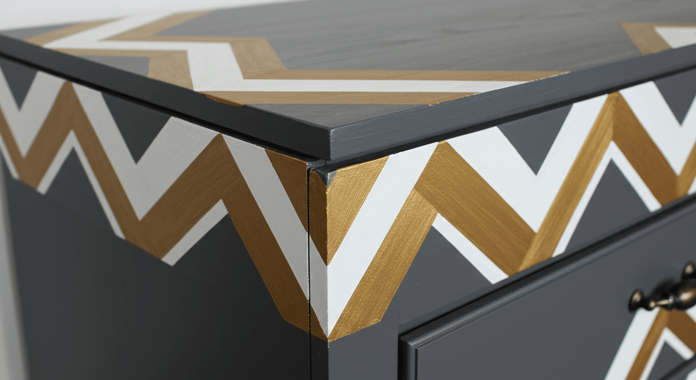 Imagine a dresser with its top and side edges painted with bright, contrasting chevron stripes in shades like black and gold. This pattern adds a graphic, contemporary element that instantly updates the piece. The sharp zigzag lines draw attention to the furniture’s form and craftsmanship. When placed in a room, it becomes an eye-catching focal point that balances modern flair with a playful design.