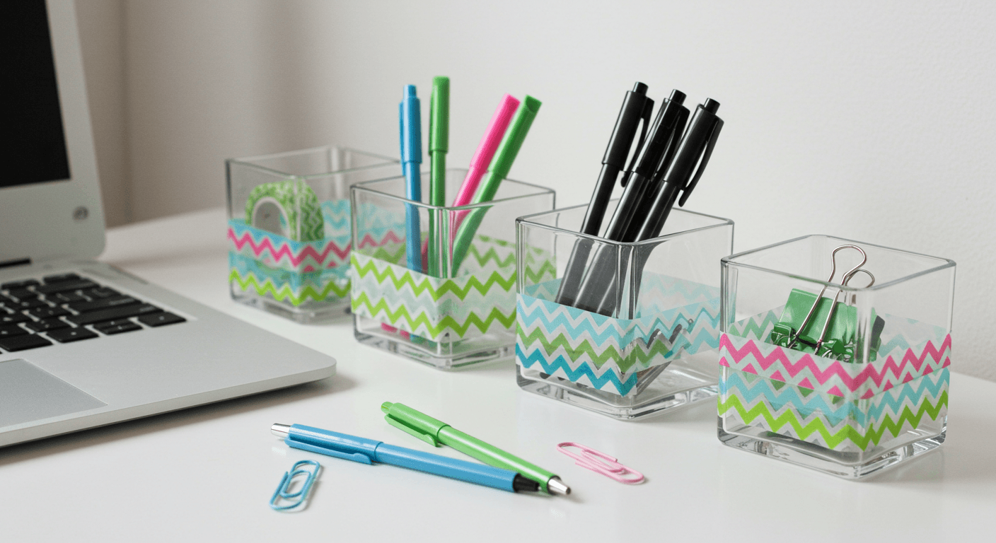 A cluttered desk can hinder focus and productivity, and generic storage containers do little to inspire. If you are seeking a stylish way to organize your stationery that also brightens your workspace, using chevron-patterned washi or painter’s tape can transform plain containers into vibrant organizers. This is a quick, customizable solution that is both enjoyable and functional.