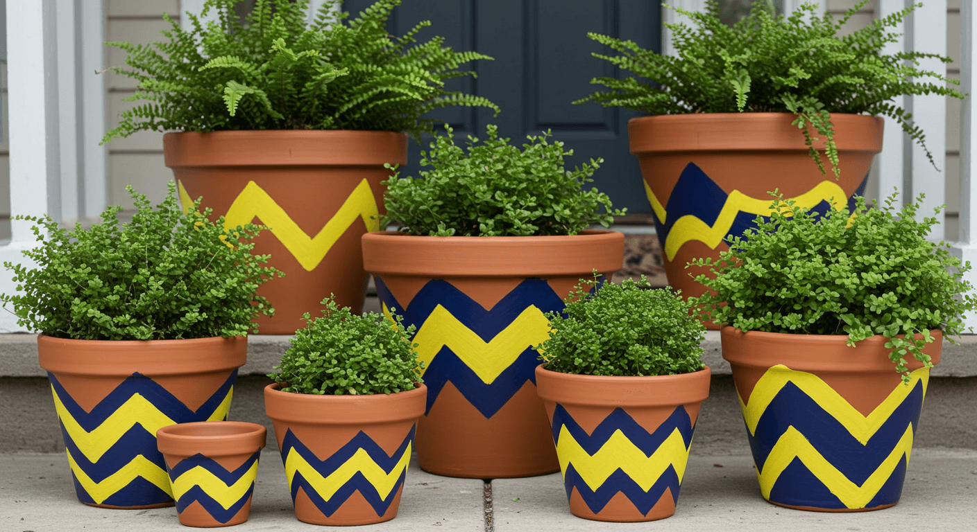 Plain planters can detract from the beauty of even the most vibrant plants. If you want to transform your plant arrangements into eye-catching features, painting chevron patterns on the pots is an excellent solution. It is a simple way to add color and personality without needing to purchase new containers.
