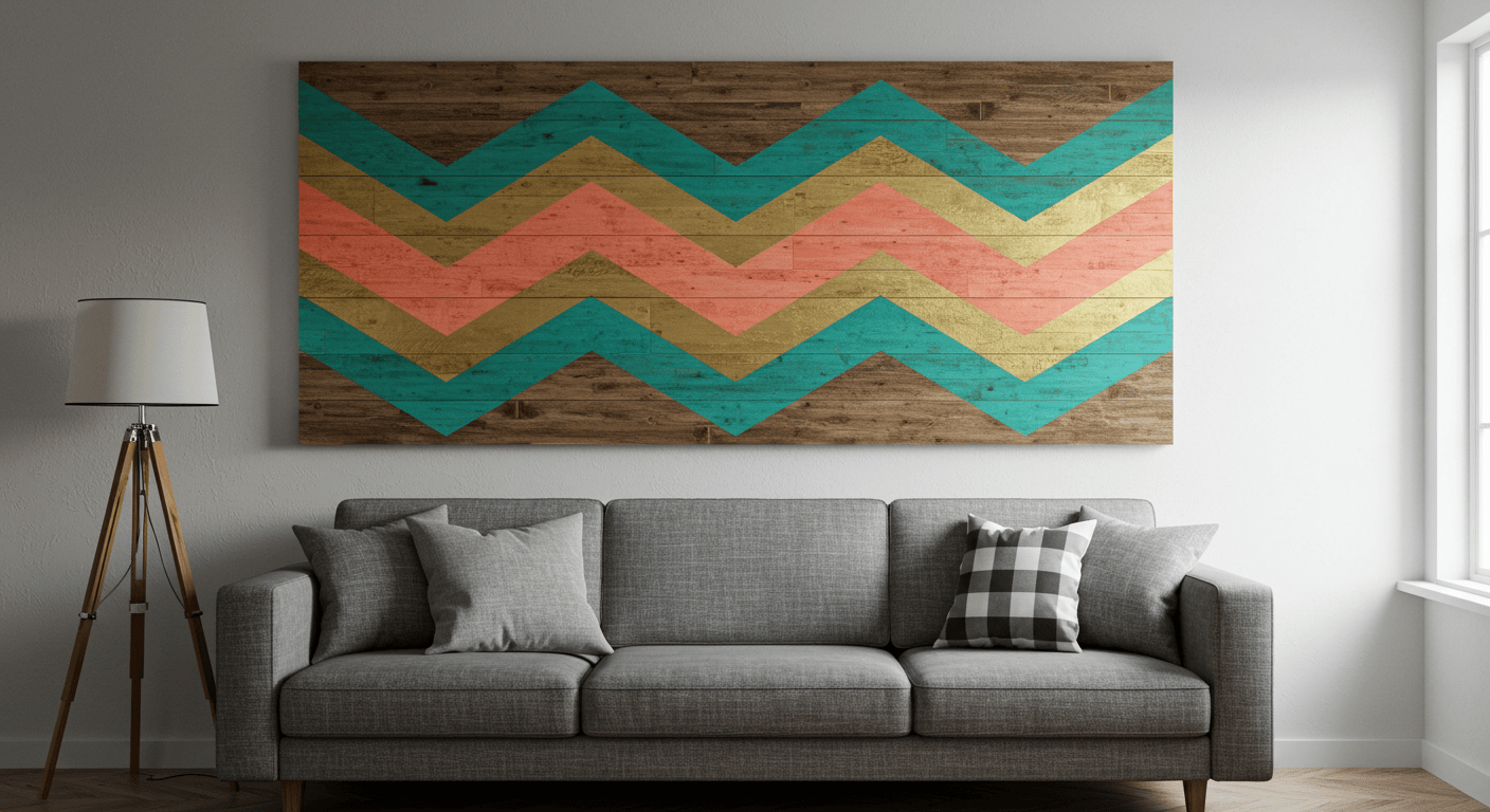 Consider large wooden planks arranged horizontally, each painted with vivid hues in a zigzag formation. The natural wood grain provides a beautiful contrast to the sharp, clean lines of the chevron pattern. When displayed above a sofa or headboard, the colors reflect light and establish a dynamic focal point. The blend of organic wood and bright paint creates a statement that is simultaneously modern and inviting.
