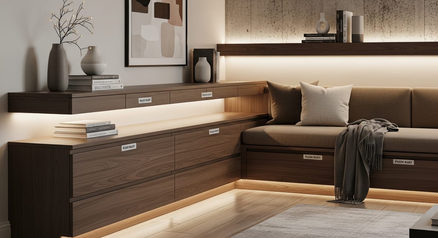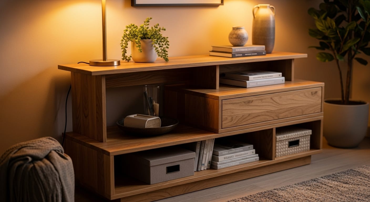 Visualize it: A slim console with smooth matte-finished drawers, integrated cubbies, and a decorative tray on top. Add a soft cream knit throw for texture and a small plant for warmth. This design blends effortlessly into modern or traditional decor.