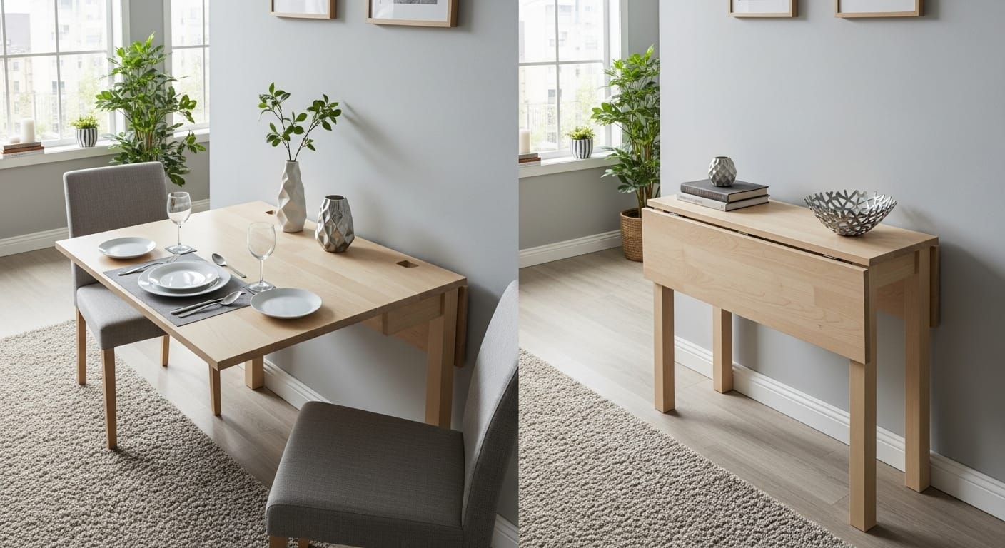 A convertible console expands when needed, offering extra workspace or a dining surface. Perfect for small spaces.
