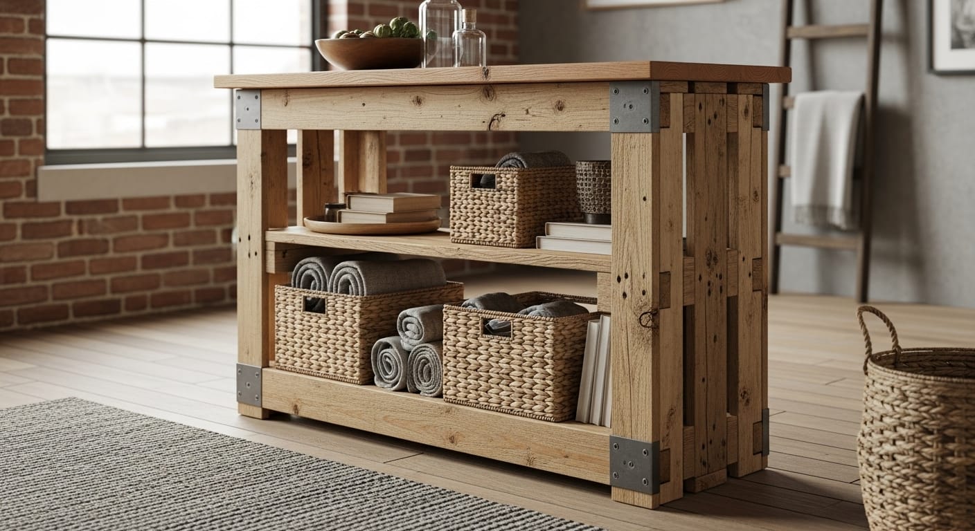 A DIY pallet console combines industrial style and affordability. Reclaimed pallets stacked with a solid top surface create rustic charm with functional shelving underneath.
