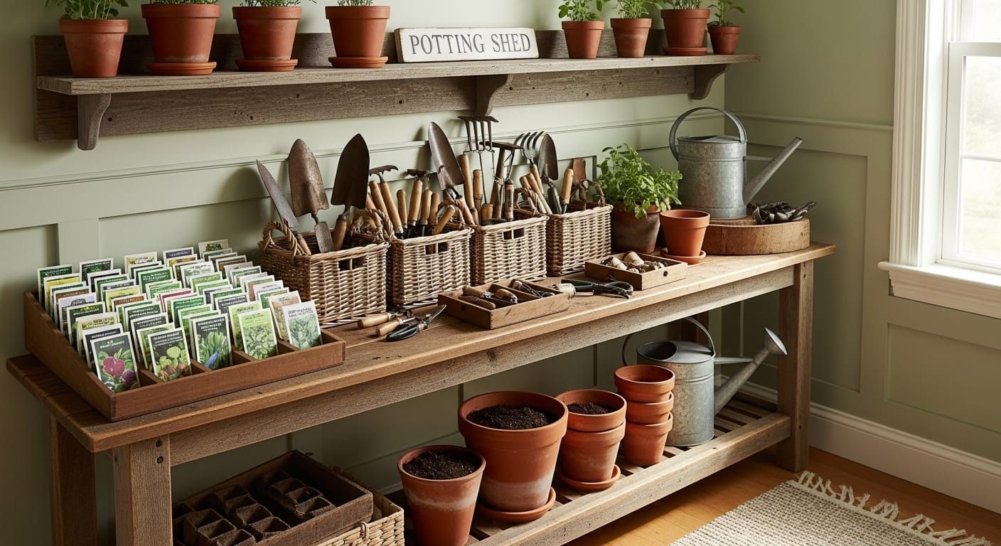 Turn a messy mudroom into an organized gardening hub with a rustic farmhouse console. Its spacious top doubles as a potting surface, with open shelves below for tools, gloves, and seed packets. Hooks on the side keep frequently used tools accessible.